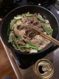 醤油と味噌をベースににんにくや生姜、白胡麻に玉葱を合わせ、泡盛や赤ワインでのばした特製漬けだれジンギスカン。くし切りにした玉葱や、ざく切りにしたキャベツやもやし等と一緒に炒め、フタをし蒸し焼きのがおすすめ。